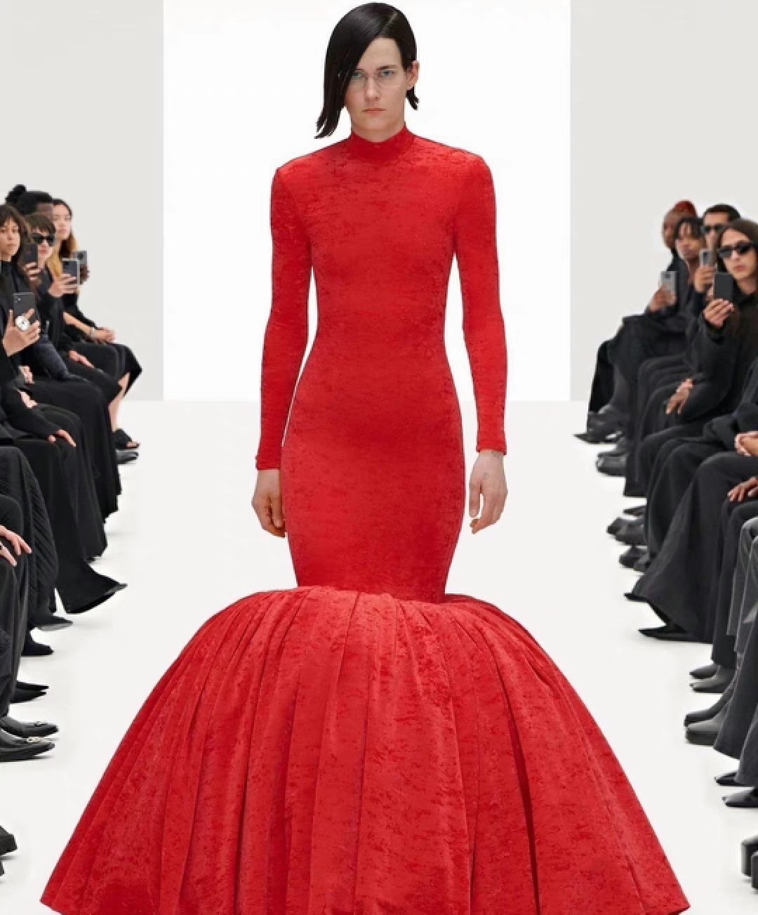 虽然以红毯为主题,但黑色调依旧占据了整个系列的大半壁江山,创意总监Demna谢幕时依旧像Met Gala时全身以黑纱遮盖,这与以往我们印象中红毯华丽礼服扎堆的情形形成鲜明反差。当然不止如此,除了以高级定制时装为灵感的优雅礼服外,Balenciaga的红毯上还出现了不少街头风单品,在致力于打破常规的Balenciaga这里“红毯不必一丝不苟,也可以轻松而随意”。