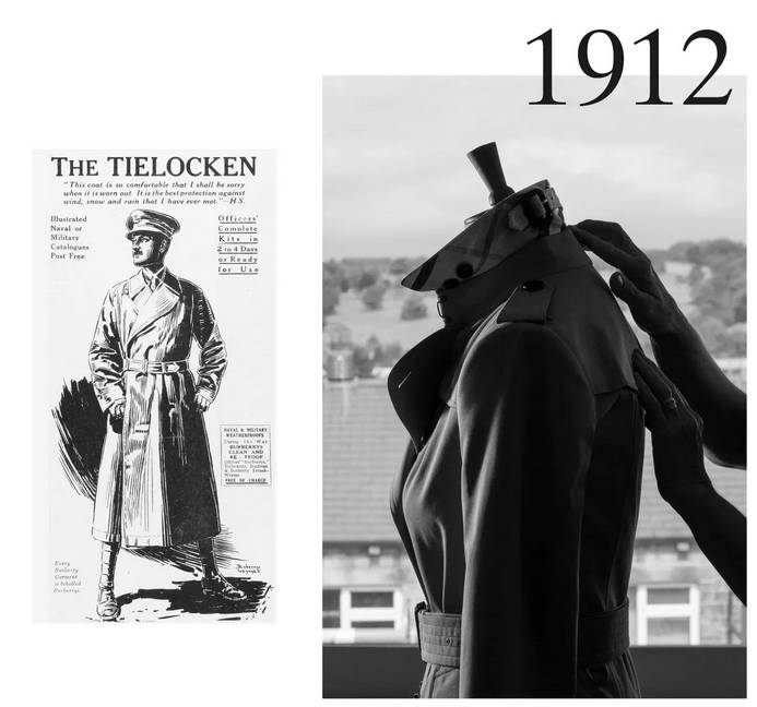 创始人 Thomas Burberry 先生亲手设计创作了Burberry Trench 风衣的早期雏形为 Tielocken 军装大衣,并获得英国专利。