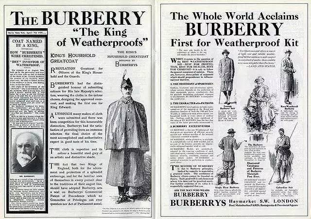 Thomas Burberry发明了gabardine(华达呢)——一种防水、耐穿而透气的面料,让厚重不堪的传统雨衣服饰焕然新生,并获得了gabardine的专利。