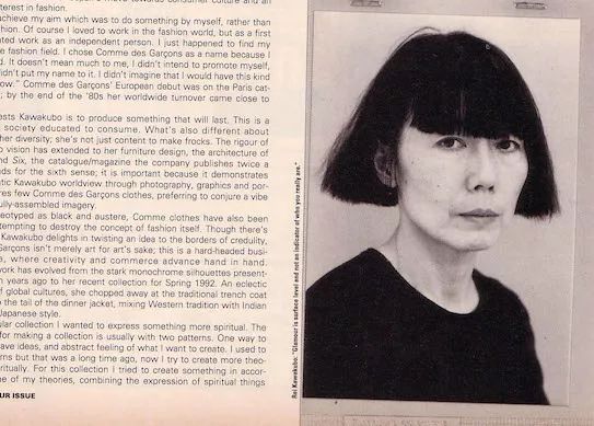 川久保玲(Rei Kawakubo)在1942年于东京出生,Comme desGarcons在1969年开创时装品牌,她的炫风在1981年的巴黎可以说是声势浩荡,当代的设计师无不对她敬佩有佳,Suzy Menkes亦宣称她是20世纪至今影响时尚最甚的设计师之一,此话Marc Jacobs也曾经说过。