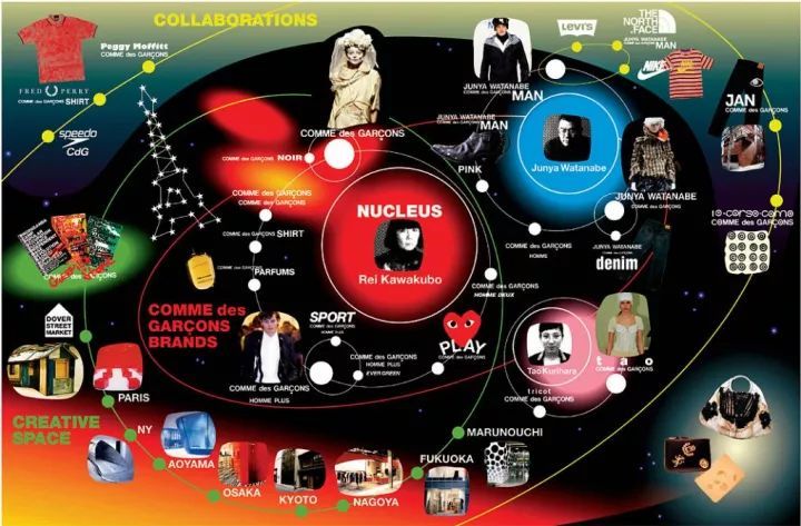 川久保玲在时尚圈的商业秘方,浅移默化的在Comme des Garçons旗下建立不同的品牌,从伸展台上的Comme des Garçons、到Comme des Garçons Black、到PLAY Comme des Garçons系列,还有香氛皮夹,在Comme des Garçons浩荡的匾额之下,提供广大的消费群众各式各样的选择。她曾和Suzy Menkes说过:「有人说我在设计一间公司而不是时装,倒也没错。创意不仅仅只是在服饰端,有趣的商业灵感、革命性的销售策略、出其不意的联名,培育着内部的人才,这些都是Comme des Garcons的创意。」她视商业为创作的一部份,因为「事业也是创造的一环。」