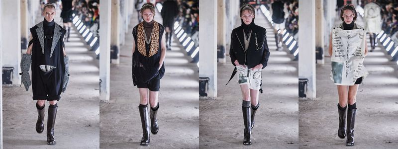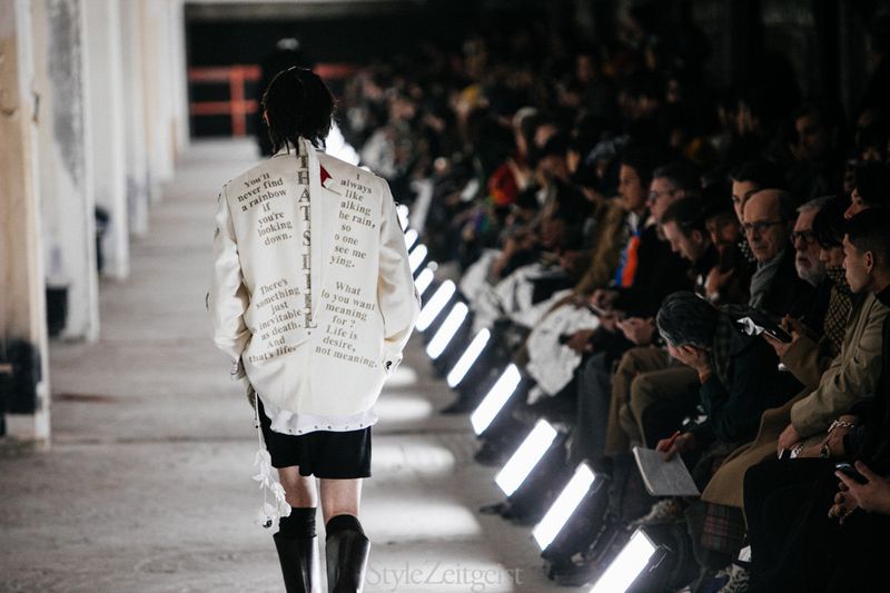 电影中小丑溜进戏院,跟上层阶级一起笑着卓别林在《摩登时代》里滑稽而惊险的舞步,小丑与卓别林的画面渐渐重叠。所以模特们化着小丑的眼妆,秀场有大量印有卓别林伤感语录的服装——“人生细看是悲剧,远眺就是喜剧了”、“我常爱雨中漫步,便无人知我流泪(莫名想起小丑笑着流泪的特写)”等,加上Takahiro擅长的看似凌乱的层次搭配,或是暗示着小丑跟卓别林间的身份认同。