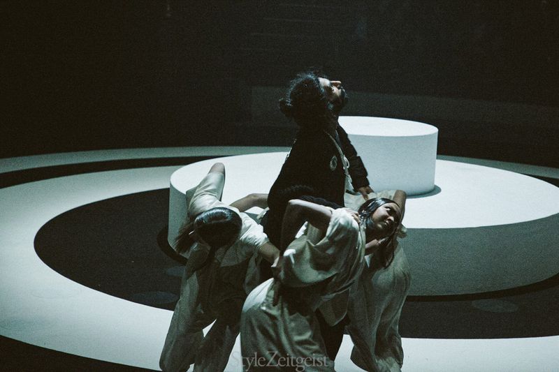 这段引用1957年黑泽明《蜘蛛巢城》的诠释性舞蹈“Fallen man”分为三个部分,源于电影中三幕关键场景,讲述了鹫津(《蜘蛛巢城》男主角)被三个代表欲望的女巫所诱而堕落,最终被乱箭射死。
