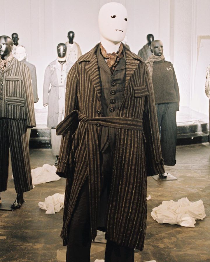 身处这一空间内,分坐于两侧和前方的来宾分明不像是秀场的看客,反而更像观摩某次审判的群众。压抑的氛围往来升腾,一道昏黄的灯光打过,停放于地面、好似白色裹尸袋的物体不规则的排列,化着诡异妆容的人孤零零站定在最上方,人们的呼吸都开始变得谨小慎微,这的确不是一个秀场,而是一次诡谲难辨的行为艺术演出。 那位孤身一人出现在舞台上的角色突然间开始念念有词地叙述着什么,在大声地喊出 saliva, snowflakes and moulted feathers of dreams 这句话后,他掀开了脚边上方的单子,露出了一个个假人模特,穿戴着此次系列的服装平躺在地。念诵诗句的人将它们一一举起、旋转,最后放置在地面,人们在这一刻方才一睹 2020 秋冬系列的真容。