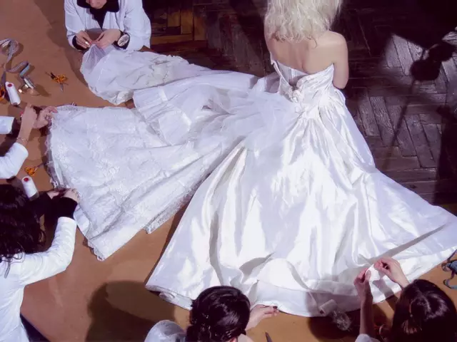 工人手工缝制晚礼服,由三条材质不同的婚纱组成