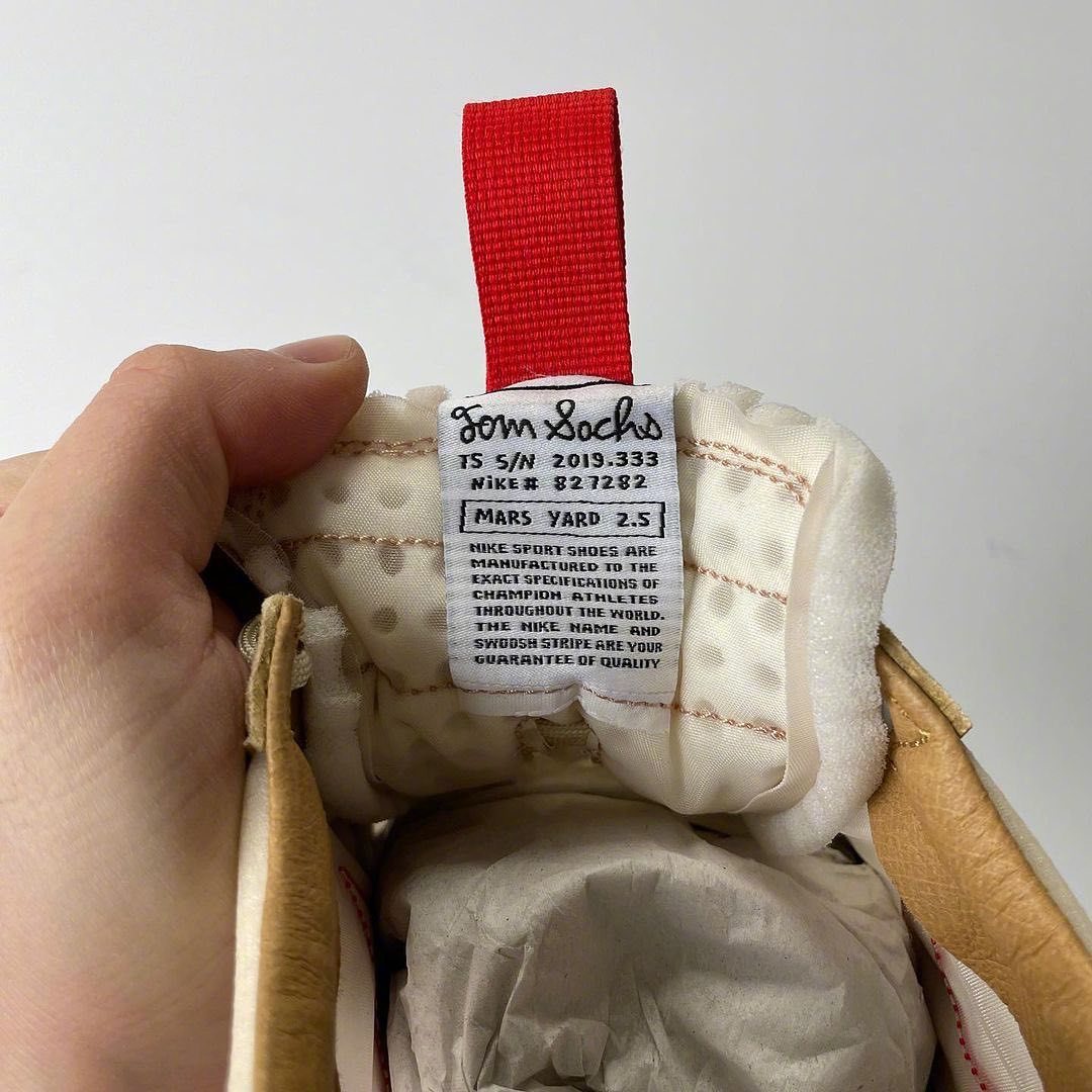 内侧露出后,这次合作 Toms Sachs ,还在 Mars Yard 经典的手写鞋盒上,引用了雕塑家 Constantin Brancusi 的名言。